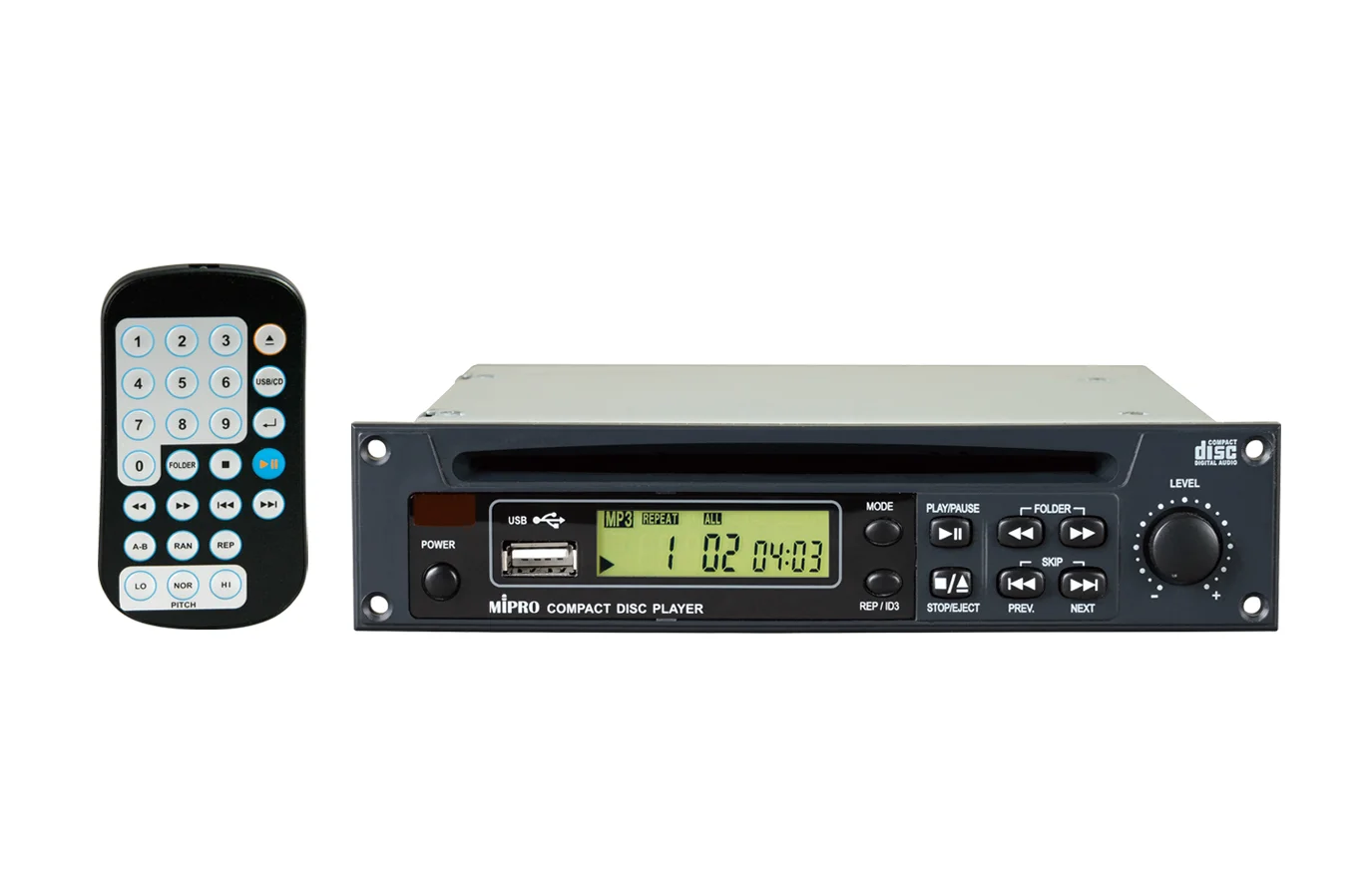 CD 與 USB 播放模組,支援 MP3/WMA 等格式,配備 LCD 顯示與紅外線遙控器,模組化設計可安裝於多款 MA 系列行動擴音機。